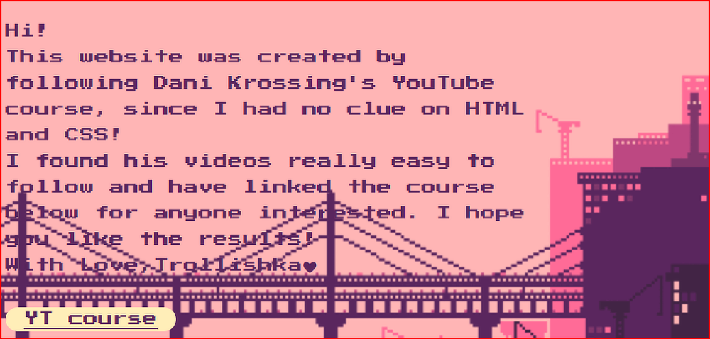 This was my first ever attempt at coding by following a step-by-step tutorial course on YouTube (only vanilla html and css, obviously)!